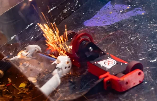Z3phyr (right) with asymmetric front/back wheel sizes, fighting spinny boiii (left) at RCL Nationals 2025
